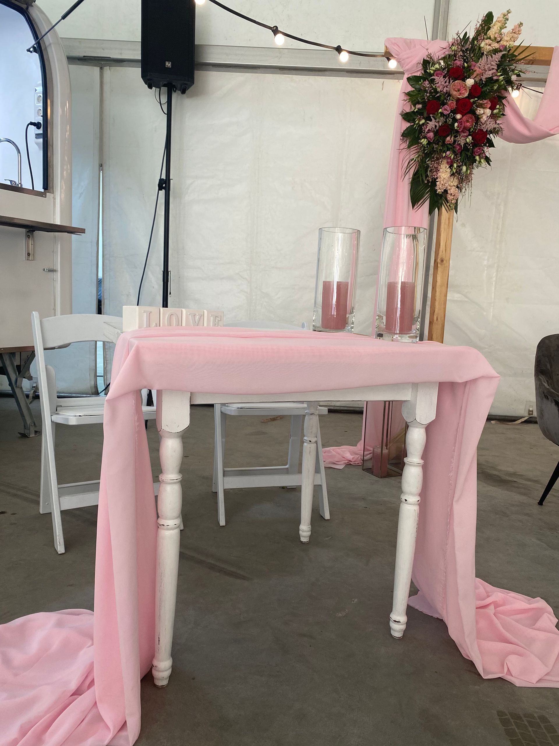 Deze backdrop bestaat uit 2 delen met de tekst " Our Wedding" te huur €75,-