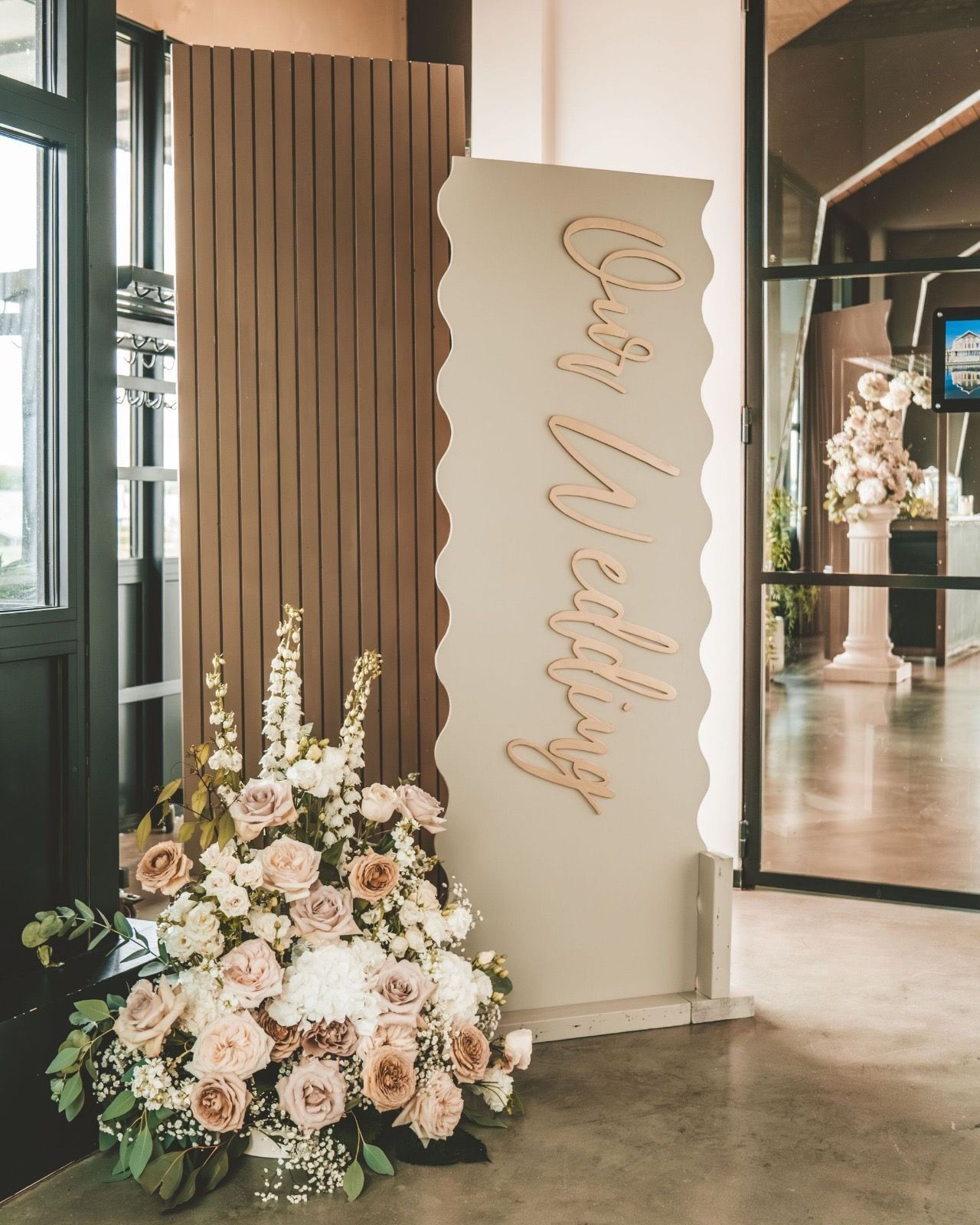 Stijlvol modern welkomstbord met golvende rand, perfect voor een luxe bruiloft. Ideaal om jullie gasten op een elegante en verfijnde manier te verwelkomen